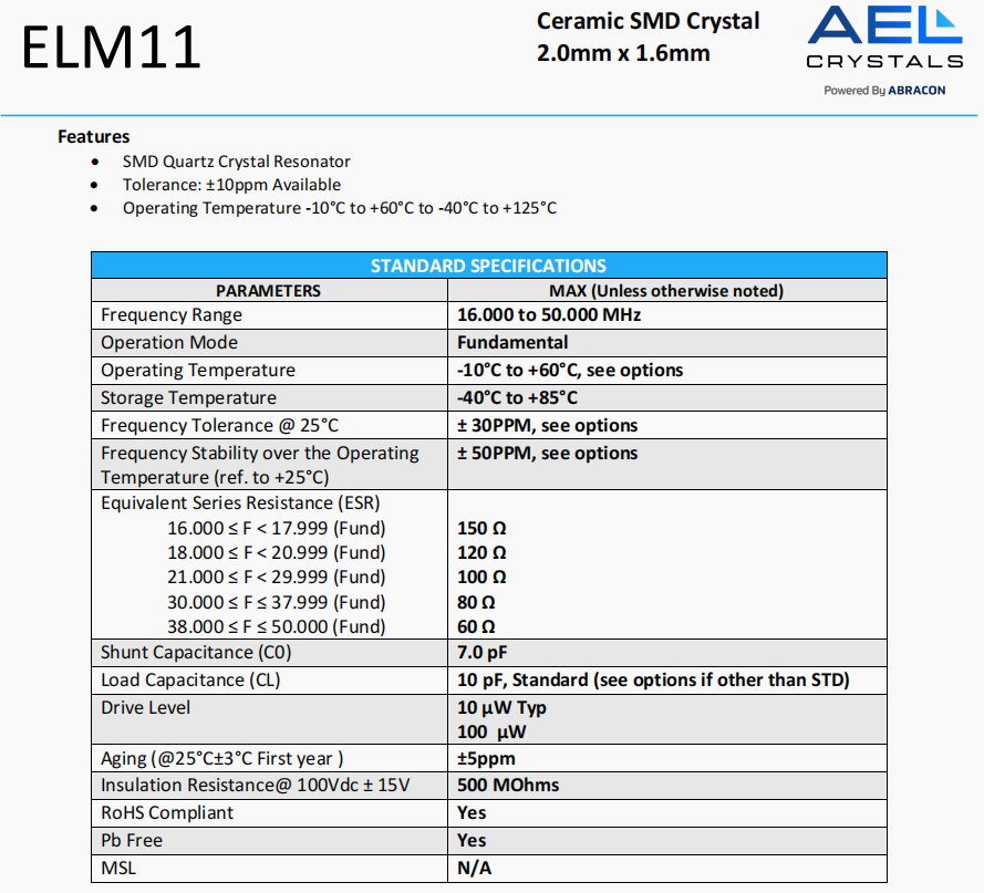 ELM11-32.000MHz-10-R60-D1X-T環保晶振,ELLS顯卡驅動晶振,ELM11高精度晶振,美國AEL晶振公司,AEL晶振,無源晶振,ELM11晶振,ELM11-32.000MHz-10-R60-D1X-T晶振,2016晶振,四腳晶振,高精度晶振,高質量晶振,貼片晶振,無源晶振,歐美晶振,小型晶振,汽車收音機晶振,車載多媒體晶振,工業設備晶振,環保無鉛晶振,石英晶振,高穩定性晶振,醫療設備晶振,低損耗晶振。特點:SMD石英晶體諧振器,公差:±10ppm,工作溫度0°C至+70°C至-55°C至+125°C。