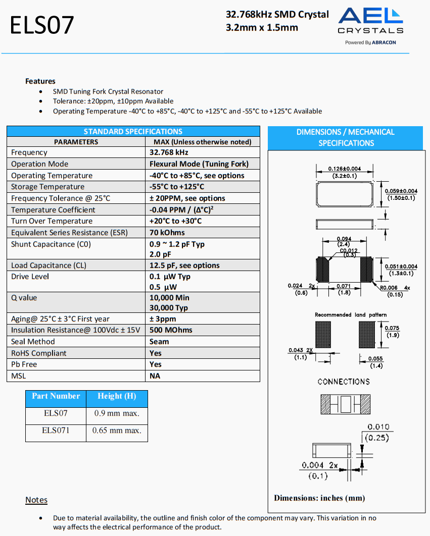 | ELS07-32.768kHz-T | AEL Crystals | ELS07 | 32.768 kHz | 0 | ±20ppm | 12.5 pF |
