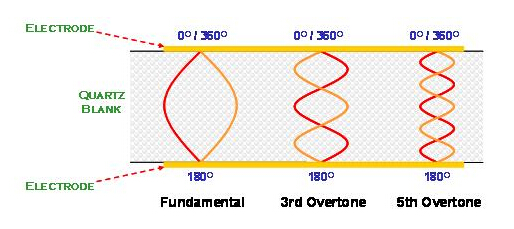 在AT切割角度的石英晶體共振子主要是以厚度剪切振蕩模態存在. "CM315-32.768KDZY-UT",石英晶體在共振時, 除了基本波振蕩之外, 高階的倍頻共振也與基本波振蕩同時存在于石英晶體的電極區域之間. 但是, 由于壓電材料的電極是電氣相位相反的振動環境, 所以, 祇有奇數倍(odd number)的高頻倍頻可以發生, 偶數倍(even number)的倍頻共振在石英晶體共振子是不會存在的(圖).