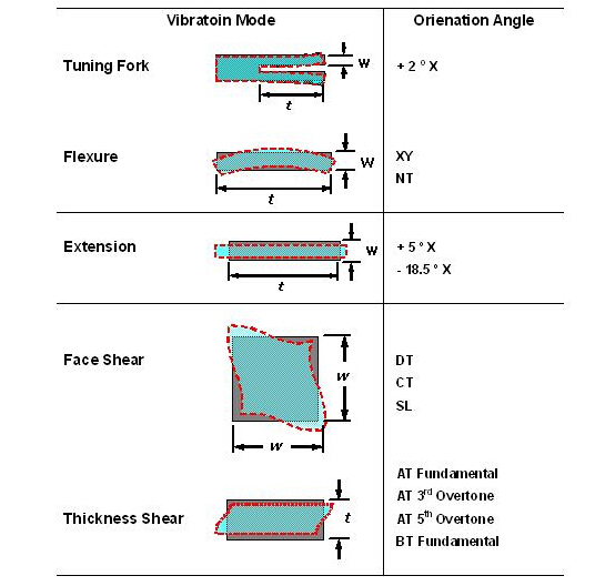 經(jīng)由不同的石英切割角度及不同電極型狀的電場(chǎng)效應(yīng), 石英芯片展現(xiàn)了各種不同的振動(dòng)模態(tài). 以經(jīng)常產(chǎn)生的振動(dòng)模態(tài)可以概分為擾曲模態(tài)(flexure mode), 伸縮模態(tài)(extension mode), 面剪切模態(tài)(face shear mode) 和 厚度剪切模態(tài)(thickness shear mode). 這幾種振動(dòng)模態(tài)以簡單的方法在表一中可以看到. 在實(shí)際狀況中, 石英芯片并不是一定祇有單一種振動(dòng)模態(tài), 而可能有多種模態(tài)同時(shí)存在在一個(gè)石英芯片的振蕩中, 經(jīng)由適當(dāng)?shù)脑O(shè)計(jì), 可以壓制其它不希望產(chǎn)生的振動(dòng)模態(tài)(unwanted mode), 來達(dá)到主要振動(dòng)模態(tài)的最佳化.