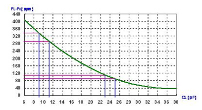 在圖中, CL=24 pF 時的頻率敏感度是10 ppm/pF, 及CL=10 pF時的頻率敏感度是20 ppm/pF. 在并聯(lián)線路中, 負(fù)載電容越小, 頻率對負(fù)載電容變化的敏感度越高. 相反的, 負(fù)載電容越大, 頻率對負(fù)載電容變化的敏感度越低. 這就是石英晶體共振子用于VCXO線路上時, 線路設(shè)計上會選用較小負(fù)載電容. 反之, 在要求較準(zhǔn)確的頻率信號時, 線路設(shè)計上會選用較高的負(fù)載電容.