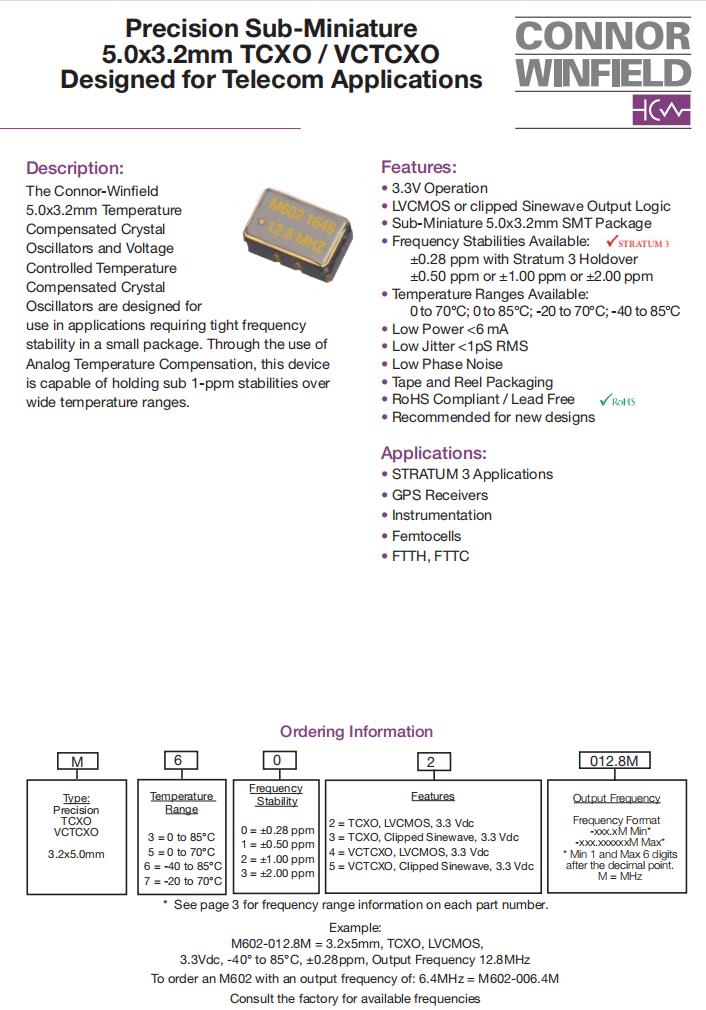 M724-020.0M,進口VC-TCXO晶振,6G模塊晶振,美國ConnorWinfield晶振,M72有源晶振,M724-020.0M晶振,5032mm晶振,VC-TCXO晶振,進口SMD晶振,LVCMOS輸出晶振,頻率20MHz,電壓3.3V,工作溫度-20~70°C,頻率穩定性1ppm,低相位噪聲晶振,高可靠性晶振,6G模塊晶振,第三層應用晶振,GPS導航晶振,儀器儀表應用晶振,無線網絡晶振.
