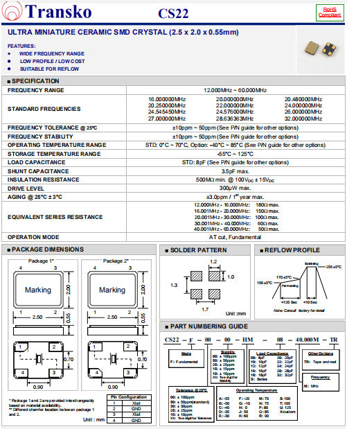 Transko晶振,CS22晶振,進口貼片晶振.小型貼片石英晶振,外觀尺寸具有薄型表面貼片型石英晶體諧振器,特別適用于有小型化要求的市場領域,比如智能手機,無線藍牙,平板電腦等電子數碼產品.晶振本身超小型,薄型,重量輕,晶體具有優良的耐環境特性,如耐熱性,耐沖擊性,在辦公自動化,家電相關電器領域及Bluetooth,Wireless LAN等短距離無線通信領域可發揮優良的電氣特性,滿足無鉛焊接的回流溫度曲線要求.