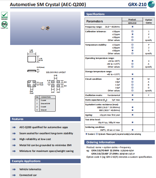 Golledge晶振,GRX-210晶振,高質量石英晶體.小型貼片石英晶振,外觀尺寸具有薄型表面貼片型石英晶體諧振器,特別適用于有小型化要求的市場領域,比如智能手機,無線藍牙,平板電腦等電子數碼產品.晶振本身超小型,薄型,重量輕,晶體具有優良的耐環境特性,如耐熱性,耐沖擊性,在辦公自動化,家電相關電器領域及Bluetooth,WirelessLAN等短距離無線通信領域可發揮優良的電氣特性,滿足無鉛焊接的回流溫度曲線要求.