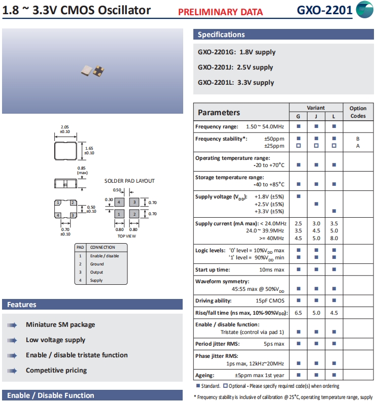 Golledge晶振,GXO-2201晶振,有源晶體振蕩器.智能手機晶振,產品具有高精度超小型的表面貼片型石英晶體振蕩器,最適用于移動通信終端的基準時鐘等移動通信領域.比如智能手機,無線通信,衛(wèi)星導航,平臺基站等較高端的數碼產品,晶振本身小型,薄型具備各類移動通信的基準時鐘源用頻率,貼片晶振具有優(yōu)良的電氣特性,耐環(huán)境性能適用于移動通信領域,滿足無鉛焊接的高溫回流溫度曲線要求.