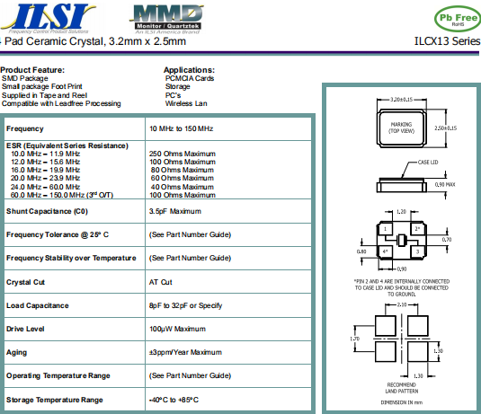 ILSI晶振,ILCX13晶振,無源環保晶體.3225mm體積非常小的SMDcrystal器件,是民用小型無線數碼產品的最佳選擇,小體積的環保晶振被廣泛應用到,手機藍牙,GPS定位系統,無線通訊集,高精度和高頻率的穩定性能,非常好的減少電磁干擾的影響,是民用無線數碼產品最好的選擇,符合RoHS/無鉛.