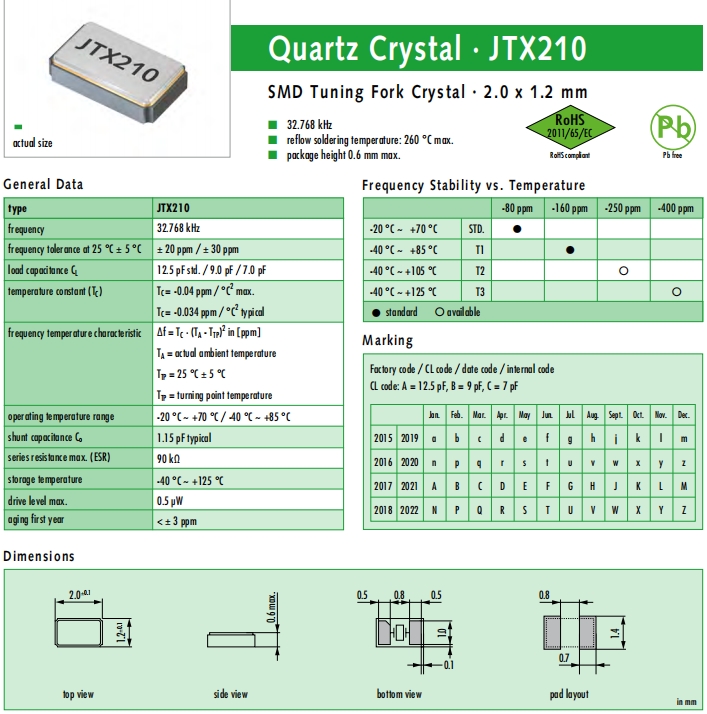 JAUCH晶振,JTX210晶振,石英晶體諧振器.32.768K系列具有超小型,薄型,質地輕的表面貼片音叉型石英晶體諧振器,晶振產品本身具備優良的耐熱性,耐環境特性,在辦公自動化,家電領域,移動通信領域可發揮優良的電氣特性,符合無鉛標準,滿足無鉛焊接的回流溫度曲線要求,金屬外殼的石英晶振使得產品在封裝時能發揮比陶瓷晶振外殼更好的耐沖擊性能.