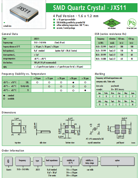 JAUCH晶振,JXS11晶振,耐高溫晶體諧振器.貼片石英晶體,體積小,焊接可采用自動貼片系統(tǒng),產(chǎn)品本身小型,表面貼片晶振,特別適用于有小型化要求的電子數(shù)碼產(chǎn)品市場領(lǐng)域,因產(chǎn)品小型,薄型優(yōu)勢,耐環(huán)境特性,包括耐高溫,耐沖擊性等,在移動通信領(lǐng)域得到了廣泛的應(yīng)用,晶振產(chǎn)品本身可發(fā)揮優(yōu)良的電氣特性,達(dá)到了無鉛焊接的高溫回流溫度曲線的標(biāo)準(zhǔn).