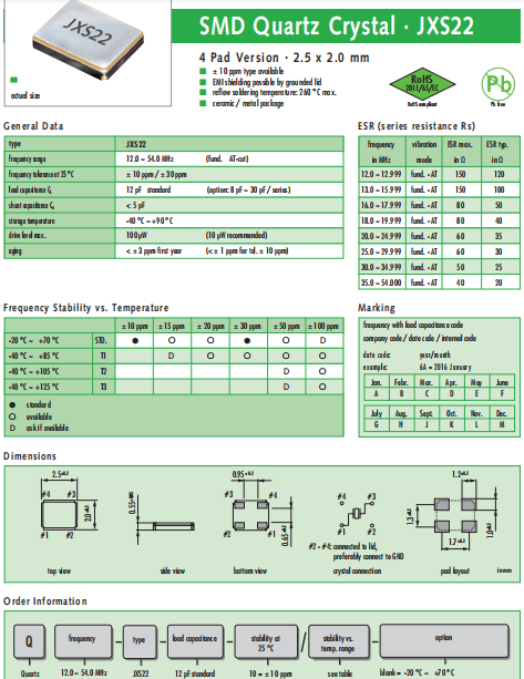 JAUCH晶振,JXS22晶振,高性能貼片晶振.小型表面貼片晶振型,是標(biāo)準(zhǔn)的石英晶體諧振器,適用于寬溫范圍的電子數(shù)碼產(chǎn)品,家電電器及MP3,MP4,播放器,單片機(jī)等領(lǐng)域.可對應(yīng)12.000MHz以上的頻率,在電子數(shù)碼產(chǎn)品,以及家電相關(guān)電器領(lǐng)域里面發(fā)揮優(yōu)良的電氣特性,滿足無鉛焊接的回流溫度曲線要求.