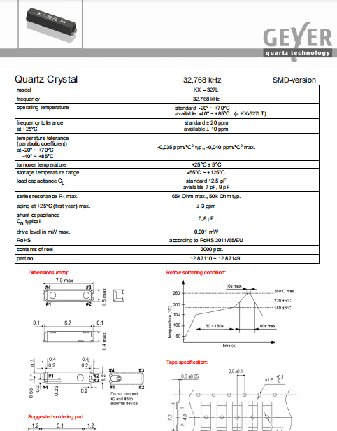 Geyer晶振,KX-327L晶振,環(huán)保石英晶體.貼片石英晶體,體積小,焊接可采用自動(dòng)貼片系統(tǒng),產(chǎn)品本身小型,表面貼片晶振,特別適用于有小型化要求的電子數(shù)碼產(chǎn)品市場領(lǐng)域,因產(chǎn)品小型,薄型優(yōu)勢,耐環(huán)境特性,包括耐高溫,耐沖擊性等,在移動(dòng)通信領(lǐng)域得到了廣泛的應(yīng)用,晶振產(chǎn)品本身可發(fā)揮優(yōu)良的電氣特性,滿足無鉛焊接的高溫回流溫度曲線要求.