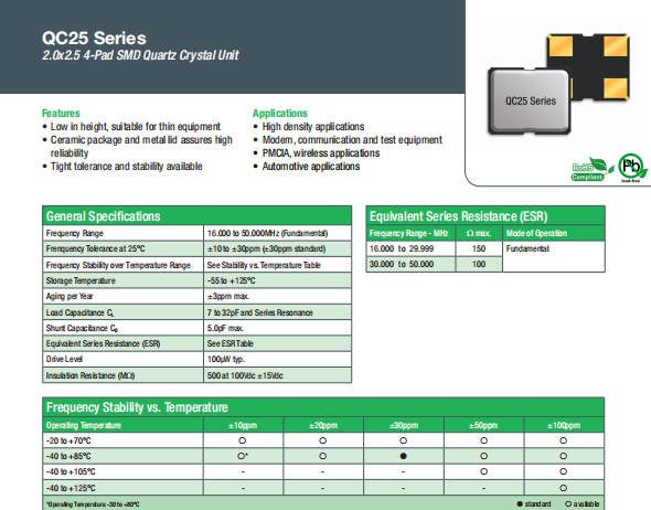 Qantek晶振,QC25晶振,高性能SMD晶振.超小型表面貼片型SMD晶振,最適合使用在通訊電子領域中,也是特別要求高可靠性的引擎控制用CPU的時鐘部分.低頻晶振可從16MHz起對應,小型,超薄型具備強防焊裂性,石英晶體在極端嚴酷的環境條件下也能發揮穩定的起振特性,產品本身具有耐熱,耐振,耐撞擊等優良的耐環境特性,滿足無鉛焊接以及高溫回流溫度曲線要求.