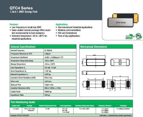 Qantek晶振,QTC4晶振,低功耗晶振.貼片晶振本身體積小,超薄型石英晶體諧振器,特別適用于有目前高速發展的高端電子數碼產品,因為晶振本身小型化需求的市場領域,小型,薄型是對應陶瓷諧振器(偏差大)和普通的石英晶體諧振器(偏差小)的中間領域的一種性價比較出色的產品.產品廣泛用于筆記本電腦,無線電話,衛星導航HDD,SSD,USB,Blu-ray等用途,符合無鉛焊接的高溫回流焊曲線特性.