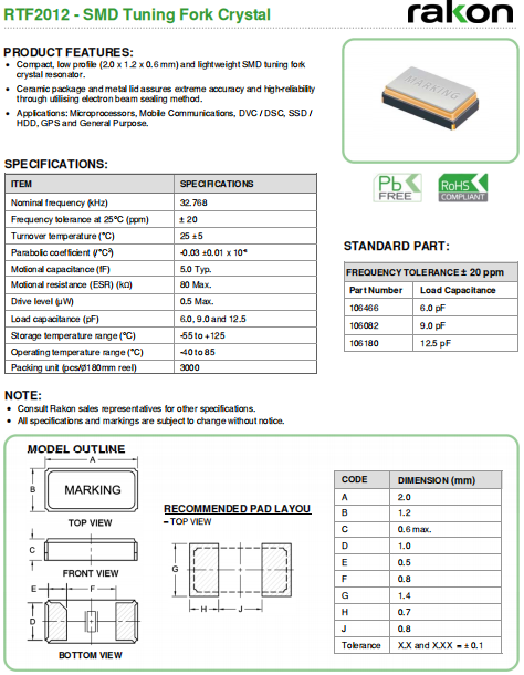 Rakon晶振,RTF2012晶振,無(wú)源貼片晶振.貼片石英晶體,體積小,焊接可采用自動(dòng)貼片系統(tǒng),產(chǎn)品本身小型,表面貼片晶振,特別適用于有小型化要求的電子數(shù)碼產(chǎn)品市場(chǎng)領(lǐng)域,因產(chǎn)品小型,薄型優(yōu)勢(shì),耐環(huán)境特性,包括耐高溫,耐沖擊性等,在移動(dòng)通信領(lǐng)域得到了廣泛的應(yīng)用,石英晶振產(chǎn)品本身可發(fā)揮優(yōu)良的電氣特性,達(dá)到了無(wú)鉛焊接的高溫回流溫度曲線的標(biāo)準(zhǔn).