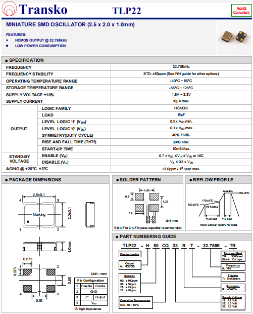 Transko晶振,TLP22晶振,貼片有源晶振.有源晶振,是只晶體本身起振需要外部電壓供應,起振后可直接驅動CMOS 集成電路,產品本身已實現與薄型IC(TSSOP封裝,TVSOP封裝)同樣的1mm厚度,斷開時的消費電流是15 µA以下,編帶包裝方式可對應自動搭載及IR回流焊接(無鉛對應)產品有幾種電壓供選1.8V,2.5V,3V3.3V,5V,以應對不同IC產品需要.