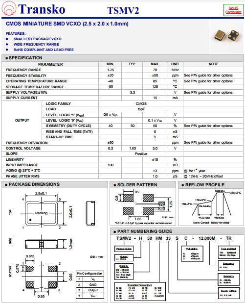 Transko晶振,TSMV2晶振,壓控晶體振蕩器.智能手機晶振,產品具有高精度超小型的表面貼片型石英晶體振蕩器,最適用于移動通信終端的基準時鐘等移動通信領域.比如智能手機,無線通信,衛星導航,平臺基站等較高端的數碼產品,晶振本身小型,薄型具備各類移動通信的基準時鐘源用頻率,貼片晶振具有優良的電氣特性,耐環境性能適用于移動通信領域,滿足無鉛焊接的高溫回流溫度曲線要求.