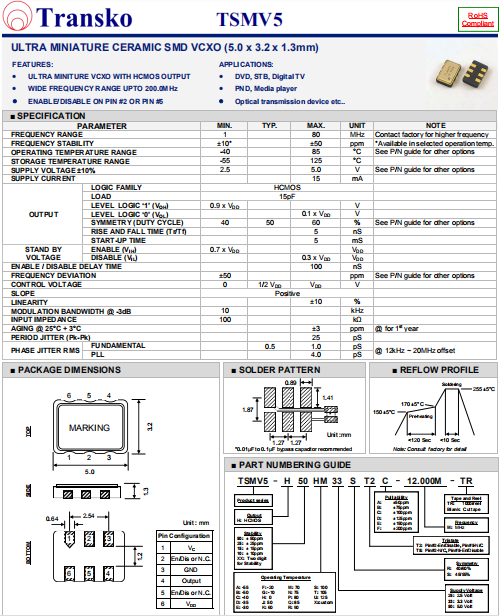 Transko晶振,TSMV5晶振,壓控晶振.小型SMD有源晶振,從最初超大體積到現(xiàn)在的7050mm,6035mm,5032mm,3225mm,2520mm體積,有著翻天覆地的改變,體積的變小也使產(chǎn)品帶來了更高的穩(wěn)定性能,接縫密封石英晶體振蕩器,精度高,覆蓋頻率范圍寬的特點,SMD高速自動安裝和高溫回流焊設(shè)計,Optionable待機輸出三態(tài)輸出功能,電源電壓范圍:1.8V~5 V,高穩(wěn)定性,低抖動,低功耗,主要應用領(lǐng)域:無線通訊,高端智能手機,平板筆記本W(wǎng)LAN,藍牙,數(shù)碼相機,DSL和其他IT產(chǎn)品的晶振應用,三態(tài)功能,PC和LCDM等高端數(shù)碼領(lǐng)域,符合RoHS/無鉛.