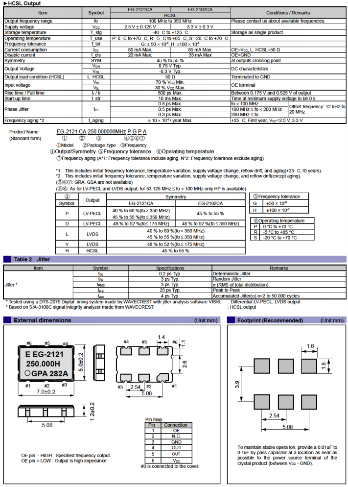 | X1M0001010002 | EG-2121CA | 100.000000 MHz | 7.00 x 5.00 x 1.20 mm | HCSL | 2.375 to 2.625 V |