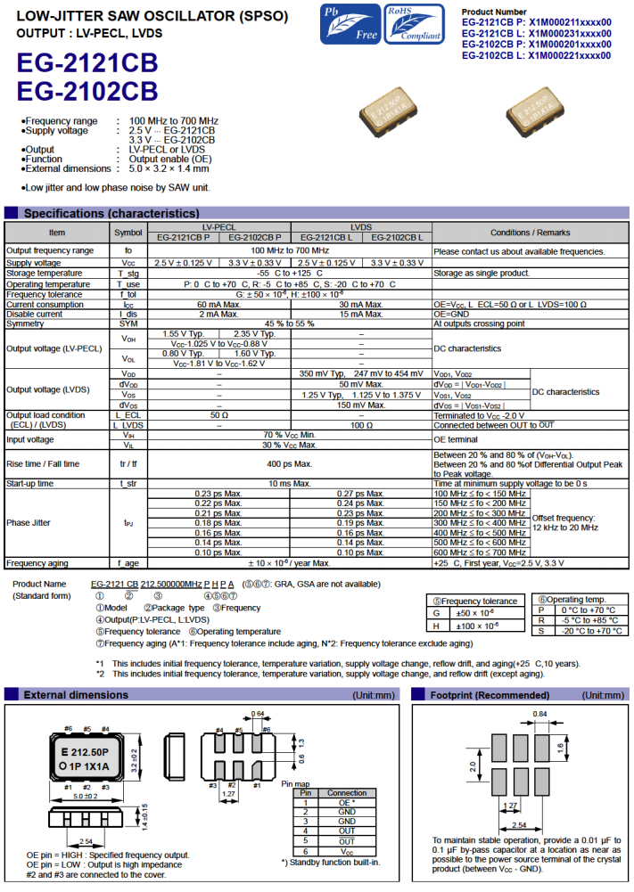 | X1M0002110001 | EG-2121CB | 156.250000 MHz | 5.00 x 3.20 x 1.40 mm | LV-PECL | 2.375 to 2.625 V |