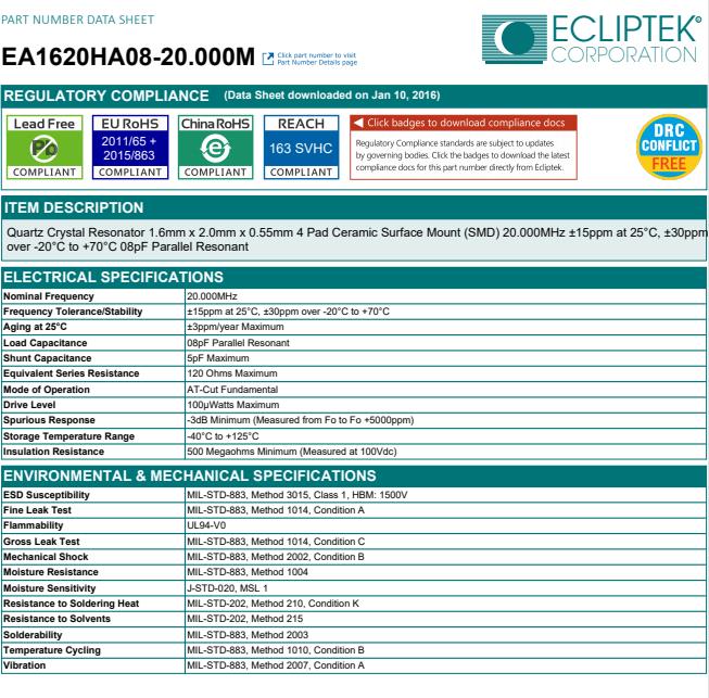 ECLIPTEK晶振,EA1620石英晶振,EA1620HA08-20.000M晶振,貼片晶振本身體積小,超薄型石英晶體振蕩器,特別適用于有目前高速發(fā)展的高端電子數(shù)碼產(chǎn)品,因?yàn)榫д癖旧硇⌒突枨蟮氖袌鲱I(lǐng)域,小型,薄型是對應(yīng)陶瓷振蕩器(偏差大)和普通的石英晶體振蕩器(偏差小)的中間領(lǐng)域的一種性價(jià)比較出色的產(chǎn)品.產(chǎn)品廣泛用于筆記本電腦,無線電話,衛(wèi)星導(dǎo)航SSD,USB,Blu-ray等用途,符合無鉛焊接的高溫回流焊曲線特性.