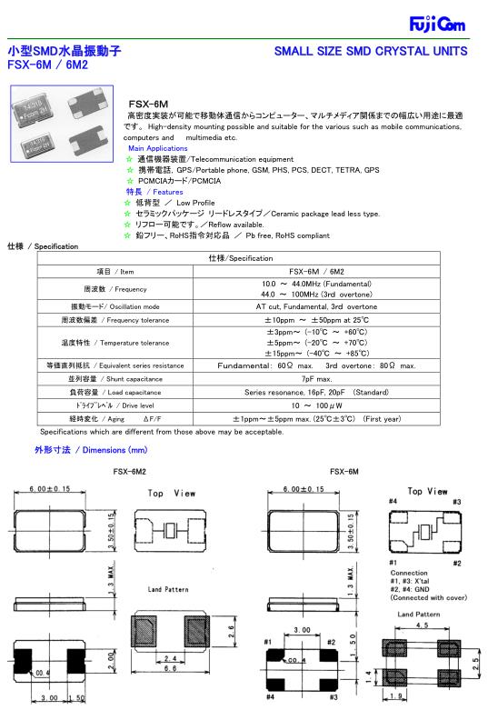 日本Fujicom晶振,FSX-6M無源貼片晶振,小型SMD晶振,貼片晶振本身體積小,超薄型石英晶體振蕩器,特別適用于有目前高速發展的高端電子數碼產品,因為貼片無源晶體本身小型化需求的市場領域,小型,薄型是對應陶瓷振蕩器(偏差大)和普通的石英晶體振蕩器(偏差小)的中間領域的一種性價比較出色的產品.產品廣泛用于筆記本電腦,無線電話,衛星導航SSD,USB,Blu-ray等用途,符合無鉛焊接的高溫回流焊曲線特性.