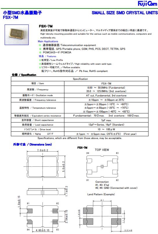 日本富士晶振,FSX-7M水晶振動子,7050石英貼片晶振,貼片晶振本身體積小,超薄型石英晶體振蕩器,特別適用于有目前高速發展的高端電子數碼產品,因為進口貼片晶振本身小型化需求的市場領域,小型,薄型是對應陶瓷振蕩器(偏差大)和普通的石英晶體振蕩器(偏差小)的中間領域的一種性價比較出色的產品.產品廣泛用于筆記本電腦,無線電話,衛星導航SSD,USB,Blu-ray等用途,符合無鉛焊接的高溫回流焊曲線特性.