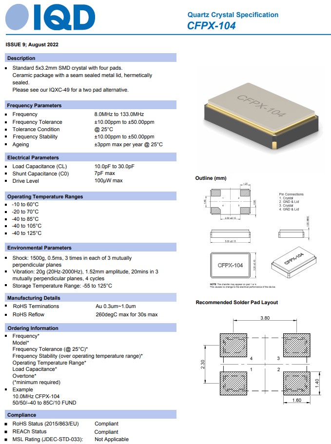 LFXTAL059539REEL,5032mm,CFPX-104,IQD石英晶體諧振器,車載晶振,參數表
