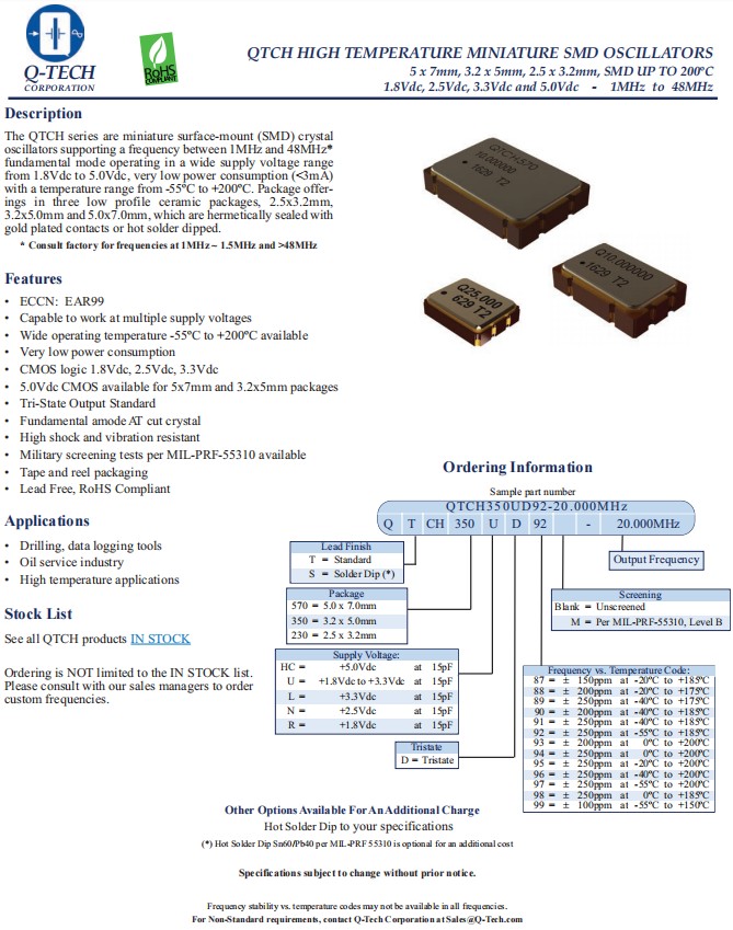 QTCH570ND90-40.000MHz|美國Q-Tech進口晶振|6G模塊晶振,Q-Tech晶振,歐美進口晶振,型號QTCH570,編碼QTCH570ND90-40.000MHz,是頻率40MHz的基模AT切割晶體,有源晶振,可根據MIL-PRF-55310提供軍事篩選測試,尺寸7050mm,電壓2.5V,負載15pF,低功耗晶振,無鉛環保晶振,耐高溫晶振,6G模塊晶振,鉆井、數據記錄工具晶振,石油服務行業晶振,高溫應用晶振.