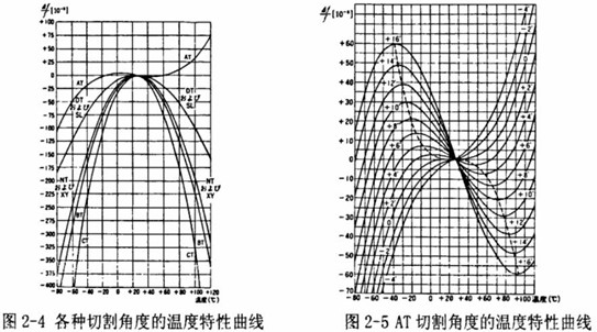 圖2-1是不同切割角度的溫度特性的比較。從圖中可以看出,當溫度在大于30℃時,按照AT角度切割的石英晶片的特性曲線比其他的特性曲線都平坦,說明在此溫度范圍內溫度變化后頻率產生的偏移量最小,溫度特性也最佳,如圖2-5所示,同是AT切割的時候,當切割角度有少量偏差時溫度特性曲線也會隨之變化。