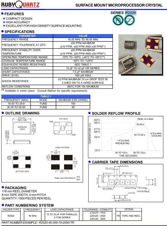 Rubyquartz盧柏晶振,R2520無源晶體,R2520-26.000-10-2050-TR晶振,小型貼片石英晶振,外觀尺寸具有薄型表面貼片型石英晶體振蕩器,特別適用于有小型化要求的市場領域,比如智能手機,無線藍牙,平板電腦等電子數碼產品.晶振本身超小型,薄型,重量輕,晶體具有優良的耐環境特性,如耐熱性,耐沖擊性,在辦公自動化,家電相關電器領域及Bluetooth,WirelessLAN等短距離無線通信領域可發揮優良的電氣特性,滿足無鉛焊接的回流溫度曲線要求.