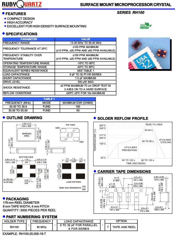 RH100水晶振動(dòng)子,盧柏進(jìn)口晶振,RH100-26.000-18-T無(wú)源諧振器,超小型表面貼片型SMD晶振,最適合使用在汽車(chē)電子領(lǐng)域中,也是特別要求高可靠性的引擎控制用CPU的時(shí)鐘部分.低頻晶振可從7.98MHz起對(duì)應(yīng),小型,超薄型具備強(qiáng)防焊裂性,石英晶體在極端嚴(yán)酷的環(huán)境條件下也能發(fā)揮穩(wěn)定的起振特性,產(chǎn)品本身具有耐熱,耐振,耐撞擊等優(yōu)良的耐環(huán)境特性,滿足無(wú)鉛焊接以及高溫回流溫度曲線要求,符合AEC-Q200標(biāo)準(zhǔn).