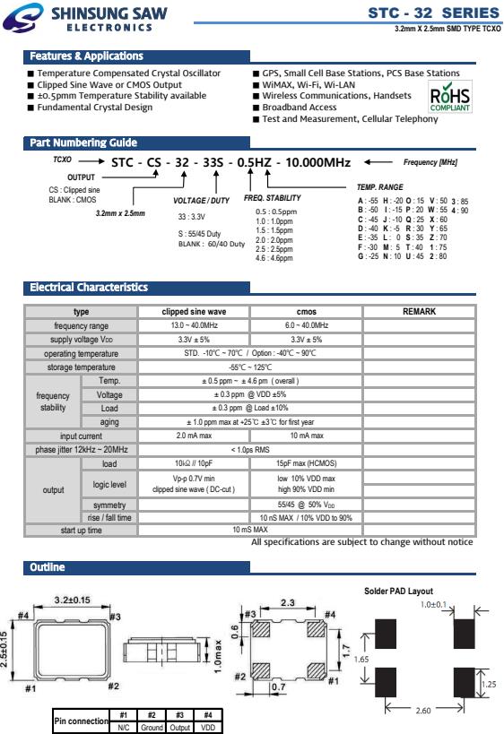韓國新松晶振,STC-32溫度補(bǔ)償晶體振蕩器,STC-CS-32-33S-0.5HZ-16.000MHz晶振,小型SMD有源晶振,從最初超大體積到現(xiàn)在的7050mm,6035mm,5032mm,3225mm,2520mm體積,有著翻天覆地的改變,體積的變小也使產(chǎn)品帶來了更高的穩(wěn)定性能,接縫密封石英晶體振蕩器,精度高,覆蓋頻率范圍寬的特點(diǎn),SMD高速自動(dòng)安裝和高溫回流焊設(shè)計(jì),Optionable待機(jī)輸出三態(tài)輸出功能,電源電壓范圍:1.8V~5V,高穩(wěn)定性,低抖動(dòng),低功耗,主要應(yīng)用領(lǐng)域:無線通訊,高端智能手機(jī),平板筆記本W(wǎng)LAN,藍(lán)牙,數(shù)碼相機(jī),DSL和其他IT產(chǎn)品的晶振應(yīng)用,三態(tài)功能,PC和LCDM等高端數(shù)碼領(lǐng)域,符合RoHS/無鉛.
