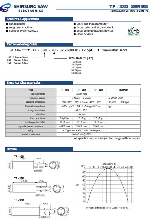 所有石英晶體諧振器和實(shí)時(shí)時(shí)鐘模塊都以IC形式提供.SHINSUNG晶振,TF-26D插件音叉晶體,TF-26D-15-32.768KHz-12.5pF晶振.