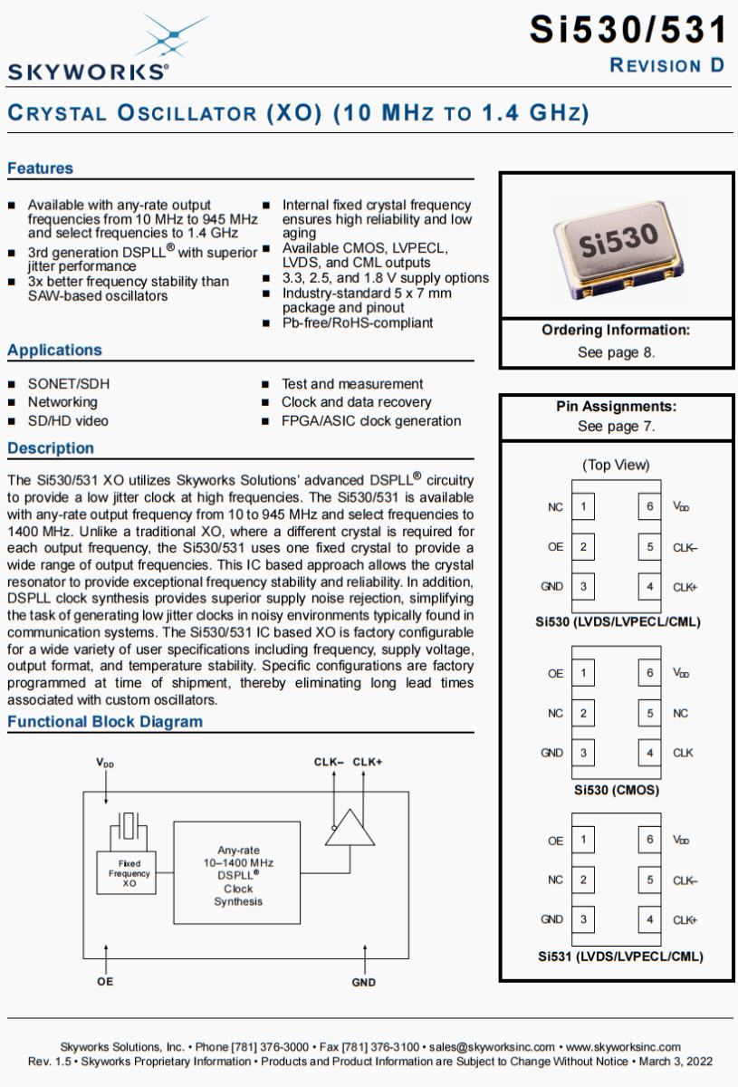| 536BB125M000DG | Skyworks晶振 | Si536 | XO | 125 MHz | LVDS | 3.3V | ±20ppm |