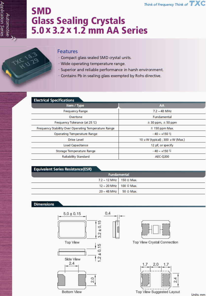 TXC臺產晶振,AA-14.31818MAGD-T晶振,汽車空調系統(tǒng)晶振,AA系列SMD,玻璃密封晶體,5.0 x 3.2 x 1.2 mm ,功能。緊湊的玻璃密封SMD晶體單元。工作溫度范圍廣。在惡劣環(huán)境下性能優(yōu)越可靠。不受Rohs指令限制的密封玻璃含鉛。臺灣TXC晶振公司,晶技晶振,無源晶振,5032晶振,AA-8.000MALV-T晶振,汽車晶振,汽車電動天窗控制系統(tǒng)晶振,臺灣晶振,貼片晶振,二腳晶振,石英晶振,高品質晶振,車載多媒體晶振,行車記錄儀晶振,低損耗晶振,耐高溫晶振,耐沖擊晶振