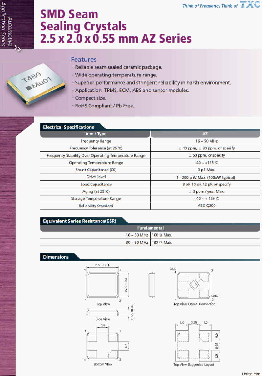 TXC晶振,無(wú)鑰匙進(jìn)入模塊晶振,AZ-37.400MEIQ-T晶振,臺(tái)灣TXC晶振公司,晶技晶振,AZ系列SMD接縫,密封晶體,2.5 x 2.0 x 0.55 mm ,特點(diǎn),可靠的接縫密封陶瓷封裝。工作溫度范圍寬。性能優(yōu)越,在惡劣環(huán)境下具有嚴(yán)格的可靠性。應(yīng)用范圍:TPMS, ECM, ABS,傳感器模塊。.ompact大小。符合rohs標(biāo)準(zhǔn)/不含鉛,臺(tái)灣晶振,進(jìn)口晶振,四腳晶振,無(wú)源晶振,網(wǎng)絡(luò)設(shè)備晶振,汽車(chē)晶振,高品質(zhì)晶振,汽車(chē)氛圍燈晶振,大燈控制器晶振,小尺寸晶振,耐高溫晶振,