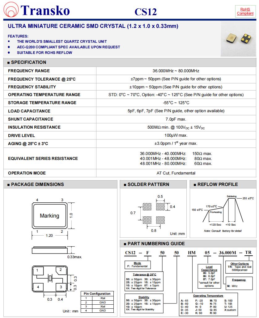 Transko晶振,CS12-F1020CQ06-20.000M-TR,6G無線應用晶振,Transko晶振,歐美進口晶振,CS12無源晶振,CS12-F1020CQ06-20.000M-TR晶振,1210mm晶振,石英貼片晶振,頻率20MHz,負載6pF,工作溫度-40~85°C,頻率穩(wěn)定性25ppm,超小體積晶振,高穩(wěn)定性晶振,6G無線應用晶振,智能手機晶振,平板電腦晶振,數(shù)碼相機晶振.