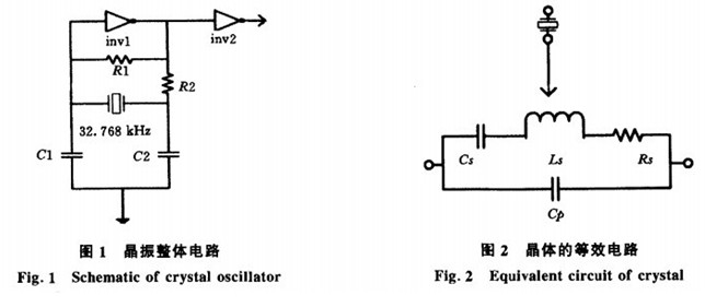 如圖1 所示是晶振的整體電路.R1為反相器invl提供偏置,使其中的MOS管工作在飽和區以獲得較大的增益;C1,C2和雜散電容一起構成晶體的電容負載, 同時它們和反相器invl一起可以等效為一負阻, 為晶體提供其振蕩所需要的能量; R2用來降低對晶體的驅動能量, 以防止晶體振壞或出現異常; 反相器inv2對invl的輸出波形整形并驅動負載.