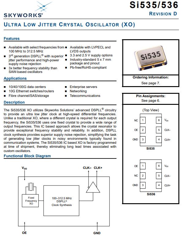 編碼501AAA27M0000CAF,Si535/536 XO時(shí)鐘晶體振蕩器,采用了Skyworks Solutions先進(jìn)的DSPLL電路以在高速差分頻率下提供超低抖動時(shí)鐘。不像傳統(tǒng)的XO,每個(gè)輸出需要不同的晶體頻率,Si535/536使用一個(gè)固定晶體來提供寬范圍的輸出頻率。這種基于IC的方法允許晶體諧振器提供卓越的頻率穩(wěn)定性和可靠性。此外,DSPLL時(shí)鐘合成提供出色的電源噪聲抑制,簡化了任務(wù)在高噪聲環(huán)境中產(chǎn)生低抖動時(shí)鐘,通常出現(xiàn)在通信系統(tǒng)。