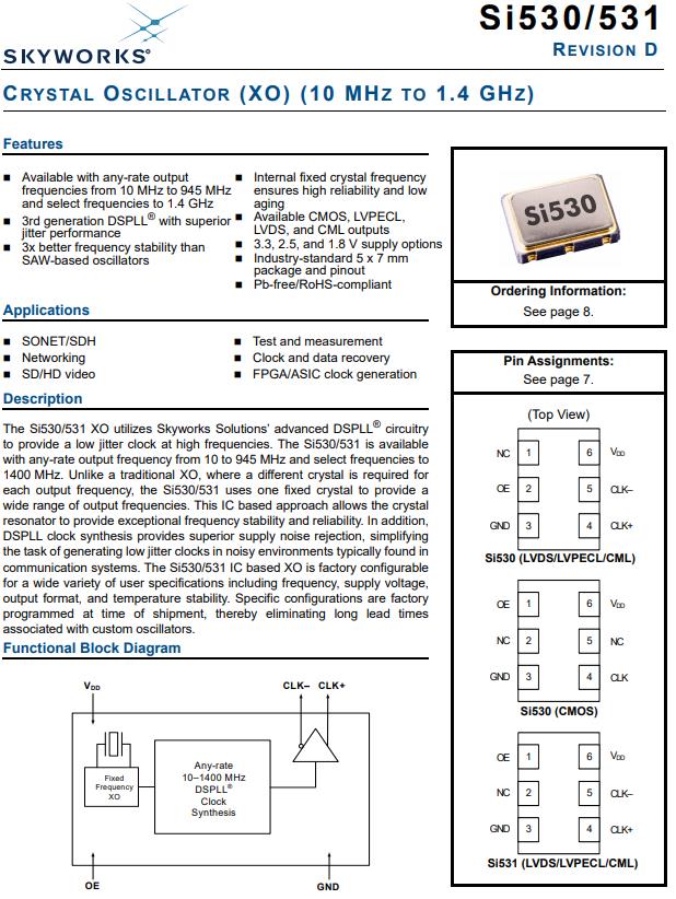 特性:可與任何速率輸出,頻率范圍為10mhz~945mhz,選擇頻率為1.4GHz,第三代DSPLL®,性能優越抖動性能,頻率穩定性優于SAW-based有源晶體振蕩器,內部固定晶頻,保證了高可靠性和低功耗老化,具備CMOS, LVPECL,LVDS和CML輸出,3.3、2.5、1.8 V供電選項,行業標準5 × 7mm封裝和引腳,Pb-free /通過無鉛認證.