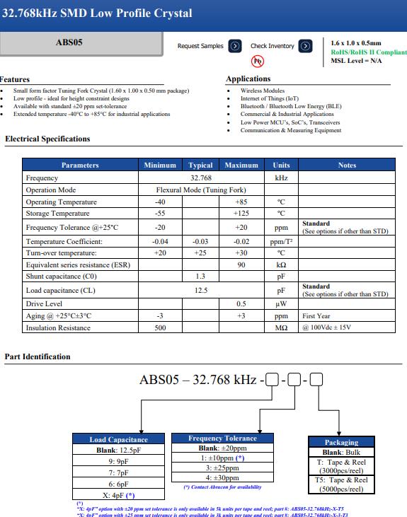 | ABS05-32.768KHZ-9-T | Abracon晶振 | ABS05 | kHz Crystal (Tuning Fork) | 32.768kHz |