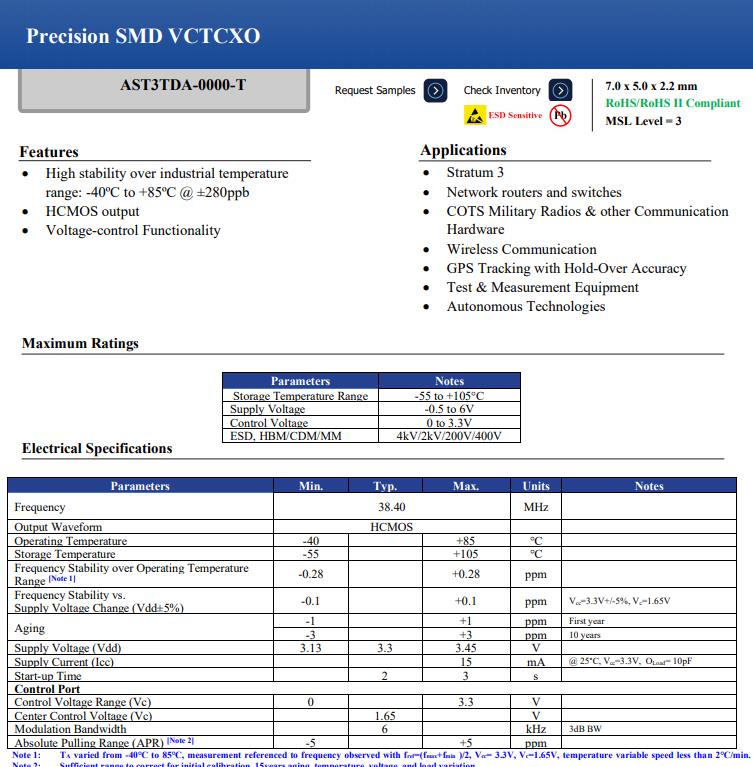 The AST3TDA-0000-T5 is a 38.400MHz temperature compensated voltage controlled crystal oscillator