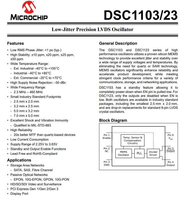 | DSC1103CI1-156.2500T | Microchip晶振 | DSC1103 | 156.25MHz | 2.25 V ~ 3.6 V | MEMS (Silicon) |