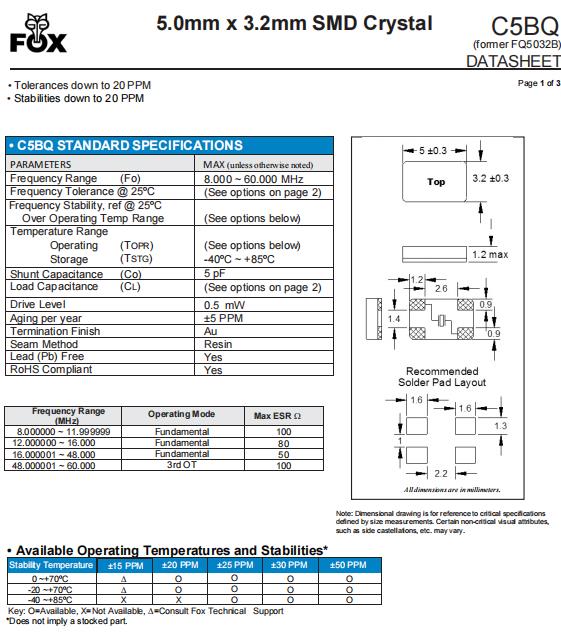 | FQ5032BR-20.000 | FOX晶振 | C5BQ | MHz Crystal | 20MHz | ±50ppm |