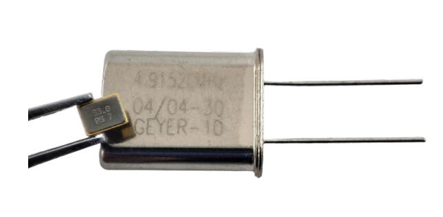 圖1:現(xiàn)代SMD晶體在舊設(shè)計(jì)的石英之上"HC-49" (3.2 x 2.5 mm或13 x 10 mm)。容納石英盤的體積要小得多。這對(duì)電性能有影響,必須考慮到這一點(diǎn)。