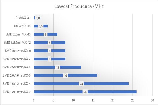 小石英晶體只有在8MHz以上可用,這個(gè)最小頻率隨著封裝變小而增加。這是由于在每個(gè)晶體的邊緣的自然干涉和不希望的振蕩模式。如果不適當(dāng)?shù)匾种七@些干擾,就會(huì)產(chǎn)生假共振。在低頻時(shí),石英圓盤的厚徑比較大,邊緣效應(yīng)的抑制變得更加困難。