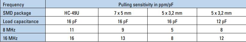 表2:不同尺寸振蕩晶體的拉靈敏度,負(fù)載電容與本設(shè)計(jì)中的典型值相對(duì)應(yīng)。