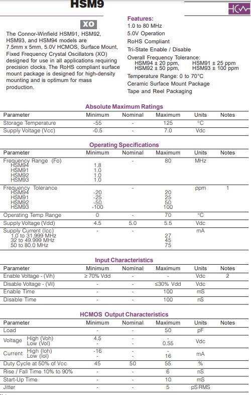 | HSM93-016.0M | Connor-Winfield振蕩器 | HSM9 | 16MHz | 0°C ~ 70°C |