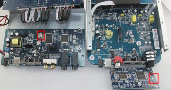 這不拆不要緊,一拆卻出呼我的意料,同樣的聲卡可是內部許多載元器件卻截然不同,就拿最常用的晶振來說,左邊是紅色那款看它內部用的是一顆HC-49/S貼片晶振,再來看看右邊這款聲卡用的卻是5032mm,24,000MHZ有源晶振,高精度貼片晶振,咱們先來看一組圖片,