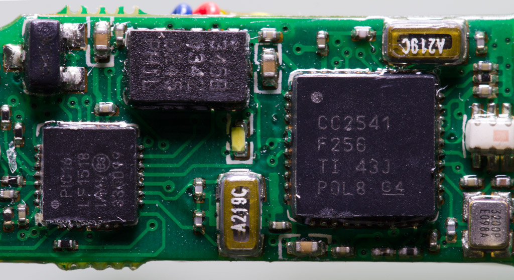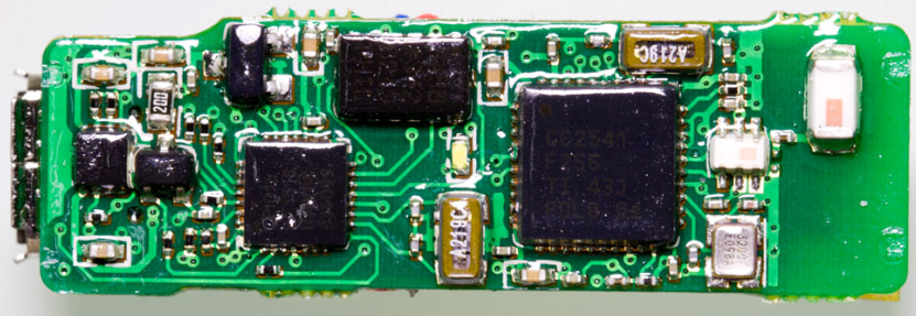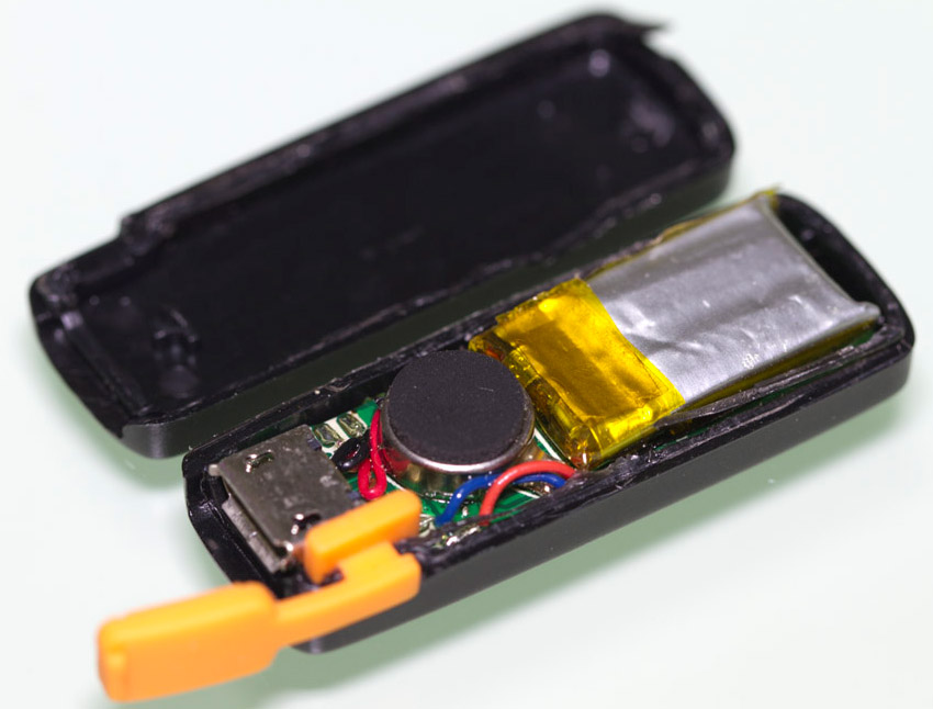 現(xiàn)在就來拆拆手環(huán)主機(jī)了,由于手環(huán)外殼采用熱熔接方式,要拆開手環(huán)只能采用暴力方式拆解.揭開外殼,可以看到智能手環(huán)主機(jī)電路板和零件,從MicroUSB膠塞固定位置上可以看到膠塞頭并沒有完全密封起來,如果游泳時帶著這個手環(huán)進(jìn)入水中可能會導(dǎo)致進(jìn)水.