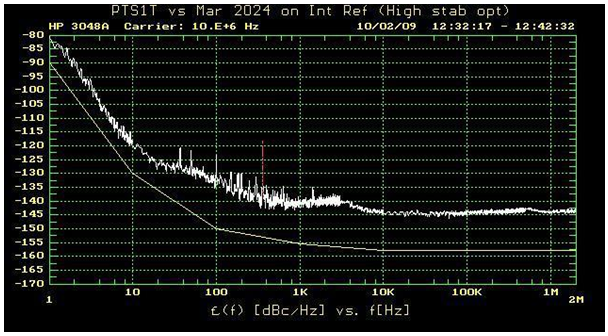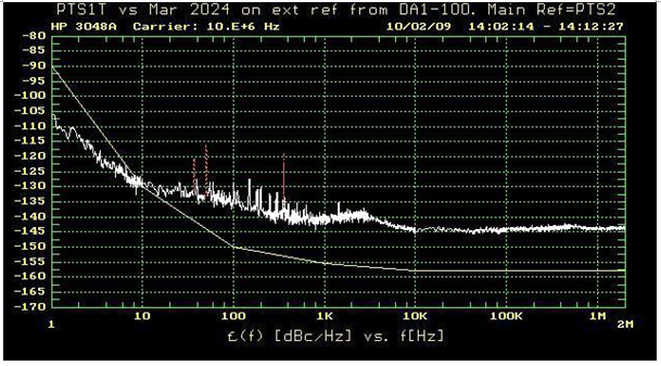 馬可尼2024現(xiàn)在設置為使用外部基準電壓源.另一個CFS10B-03用作外部基準電壓源. 相位噪聲的測量方法與以前完全相同.